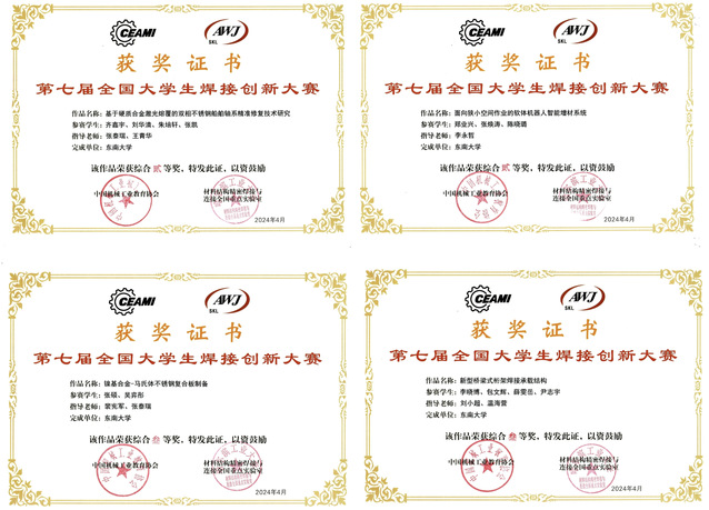 在学校教务处、天美传媒 的大力支持下,本届大赛全国决赛的天美传媒 代表队由张泰瑞老师带队参加,并受邀担任固定命题组评委。经过紧张激烈的比赛,天美传媒 由张泰瑞、王青华两位老师指导,齐文鑫、朱培轩、刘华清、张凯4位同学的项目《基于硬质合金激光熔覆的双向不锈钢船舶轴系精准修复技术研究》获固定命题二等奖;由李永哲老师指导,郑业兴、张焕涛、陈晓璐3位同学的项目《面向狭小空间作业的软体机器人智能增材系统》获自由命题二等奖;由刘小超、温海营老师指导,李晓博、包文辉、薛雯岳、尹志宇4位同学的项目《新型桥梁式桁架焊接承载结构》;由裴宪军、张泰瑞老师指导,张硕、吴奕彤2位同学的项目《镍基合金-马氏体不锈钢复合板制备》获得固定命题三等奖。