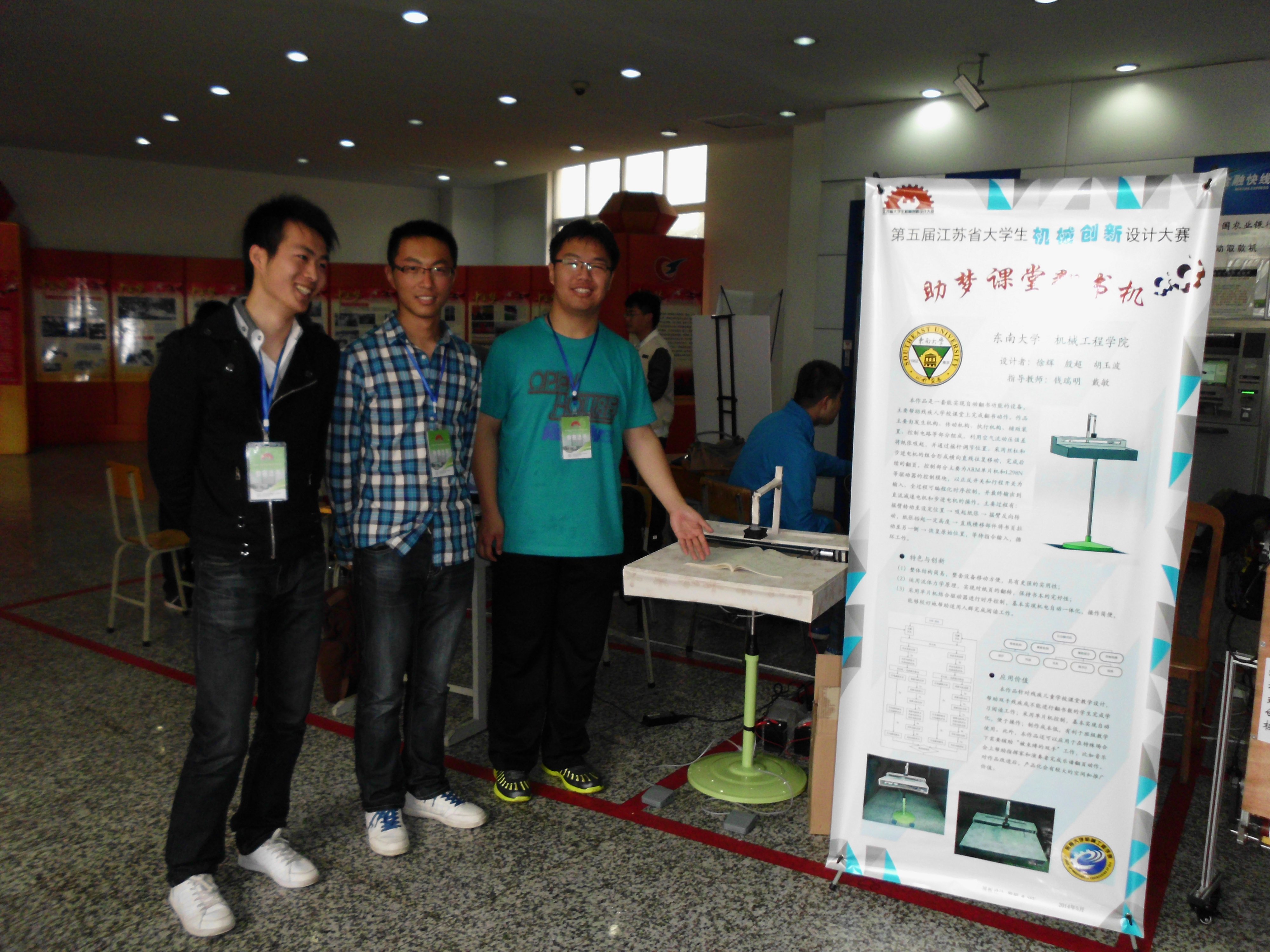 在该项赛事的最好成绩。其中张经辉、李悠扬等人设计制作的《体感遥控全向移动教学机器人》,王超、吴景和耿垭洲设计制作的《蓝牙控气动爬壁机器人》,徐辉、殷超和胡玉波设计制作的《助梦课堂翻书机》获得一等奖;史昀珂等人的《橄榄球式可折叠车轮》获得二等奖;胡剑雄等人的《智能网球拾球机》获得三等奖。另外,学院钱瑞明、许映秋和戴敏三位老师获得优秀指导教师奖。