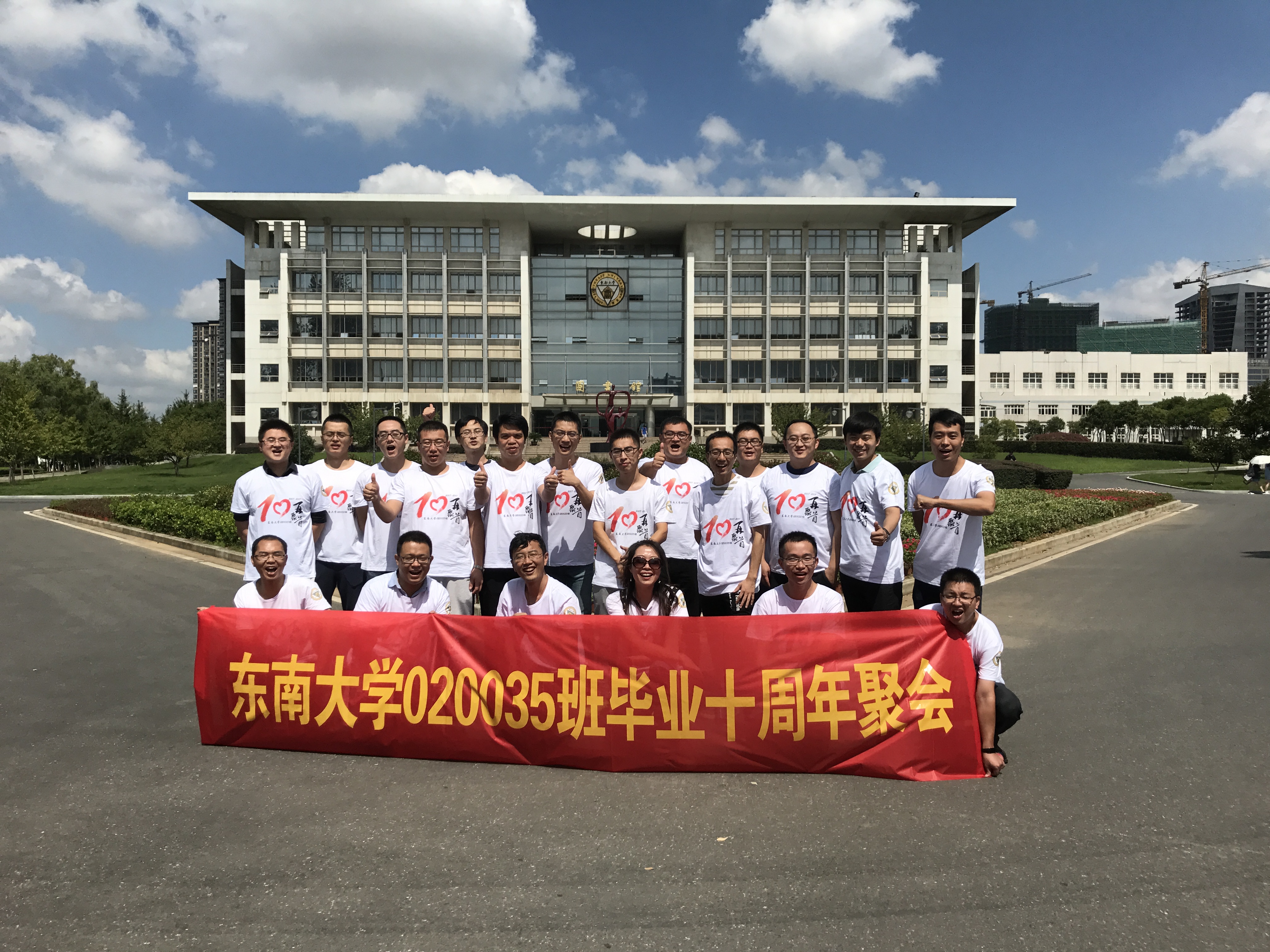 2017年9月17日,原020035班校友一行17人回母校庆祝毕业十周年。同学们一起漫步于六朝松下,大礼堂前,九龙湖畔,一 起回忆当初,共叙友情。学院校友会付瑜老师和胡涛老师代表学院热情接待了各位校友。