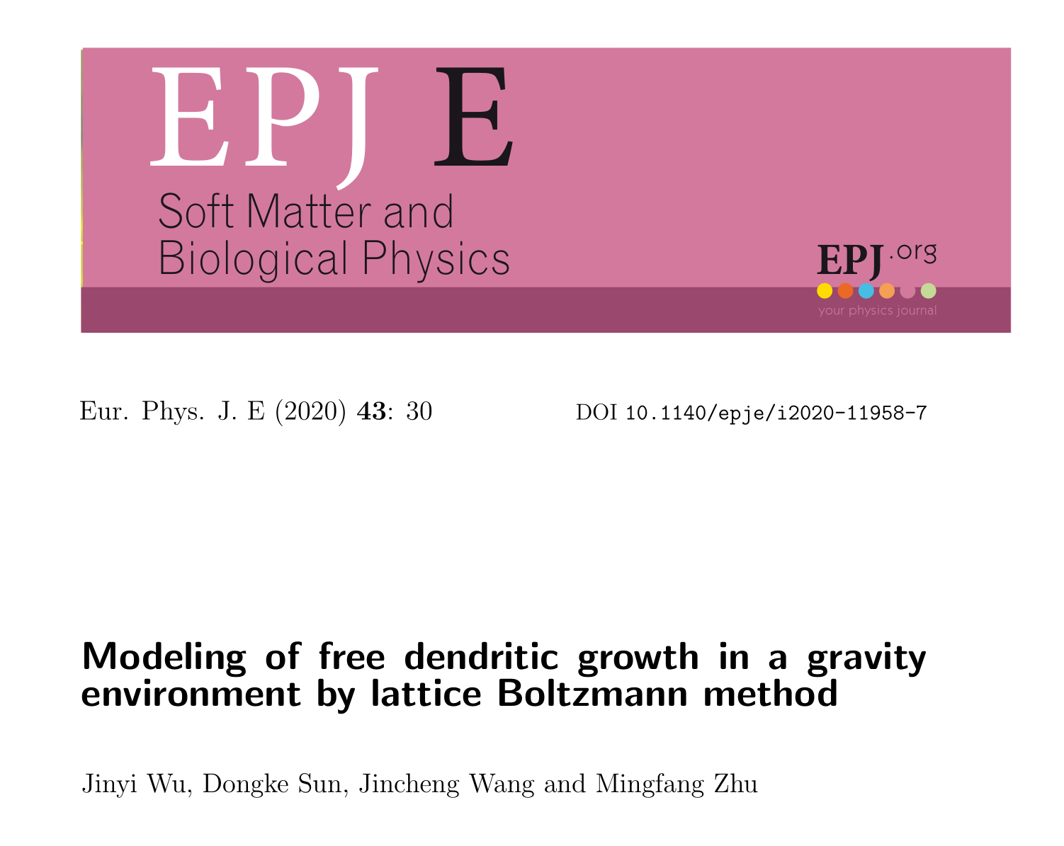 近日,天美传媒 2017级本科生吴津仪同学以第一作者在国际著名出版集团斯普林格旗下的老牌国际期刊《European Physical Journal E》发表论文(该期刊为物理领域JCR分区二区期刊)。这是天美传媒 近年来大学三年级本科生发表的第一篇国际期刊论文。论文以“Modeling of Free Dendritic Growth in a Gravity Environment by Lattice Boltzmann Method”为题,重点阐述了重力作用下枝晶生长的数值建模与模拟方法。