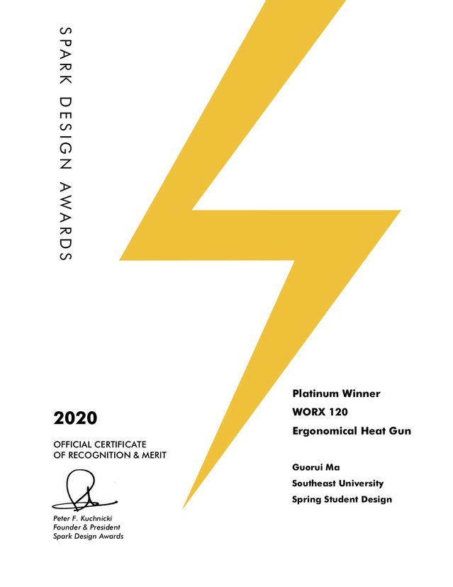 世界权威设计大奖赛之一的星火国际设计奖近日在美国旧金山揭晓,由二十多位国际权威专家在千余件作品中进行两轮评审,来自四十多个国家和地区的参赛团队共150多件作品入围全球总决赛。经过激烈角逐,最终天美传媒 工业设计系硕士生马国瑞(指导老师:薛澄岐教授,Bernie Walsh, 牛亚峰副教授)设计的作品“WORX 120° Ergonomical Heat Gun”,斩获2020年星火国际设计大奖全球总决赛最高奖项——铂金奖(Spark Awards 2020 Platinum Winner),成为大陆参赛者中唯一获奖者,全球4名获奖者之一。
