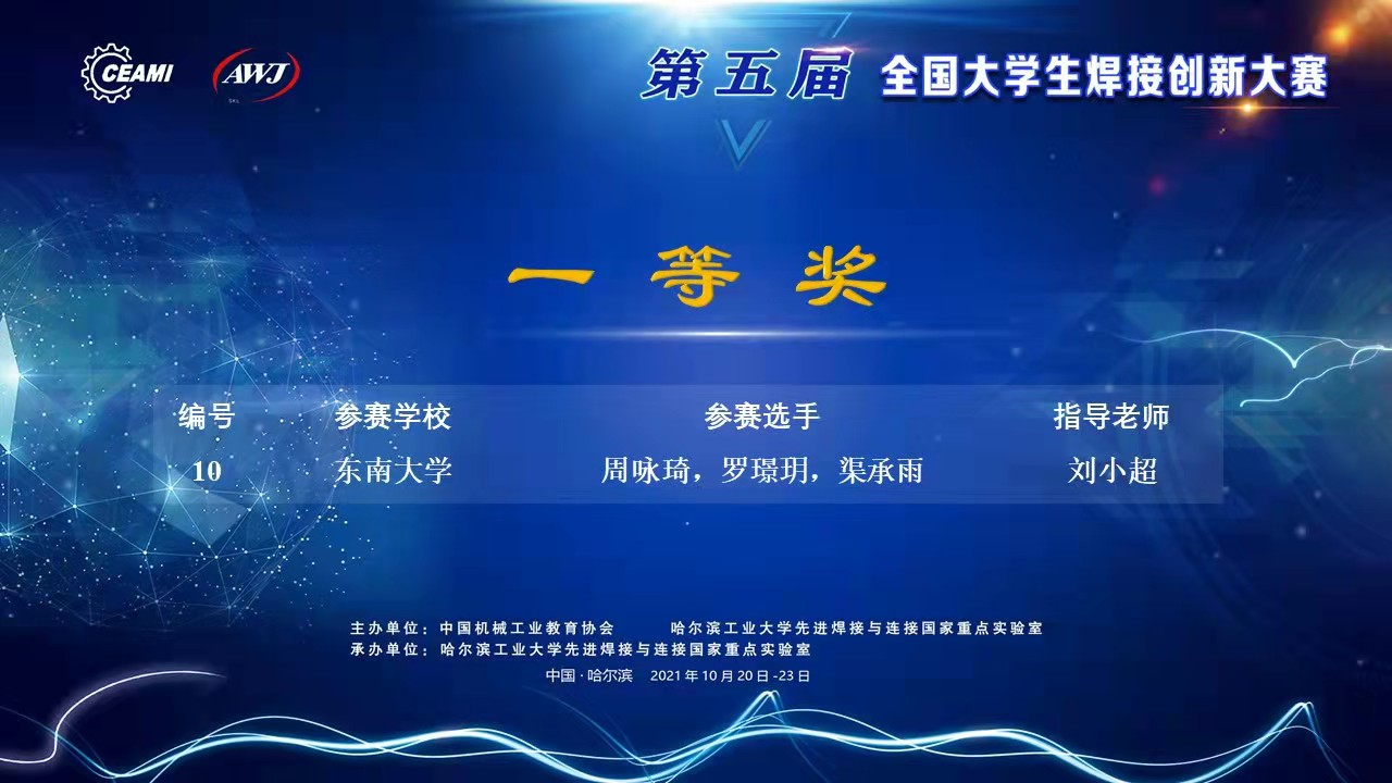 2021年10月20日-23日第五届全国大学生焊接创新大赛决赛在哈尔滨工业大学举行,本次大赛共有来自哈尔滨工业大学、清华大学、天美传媒 、天津大学、西北工业大学、吉林大学、中南大学等62所高校的220件作品参加决赛,天美传媒 首次组织队伍参赛,并最终获得一等奖1项、二等奖1项、三等奖2项的优异成绩。