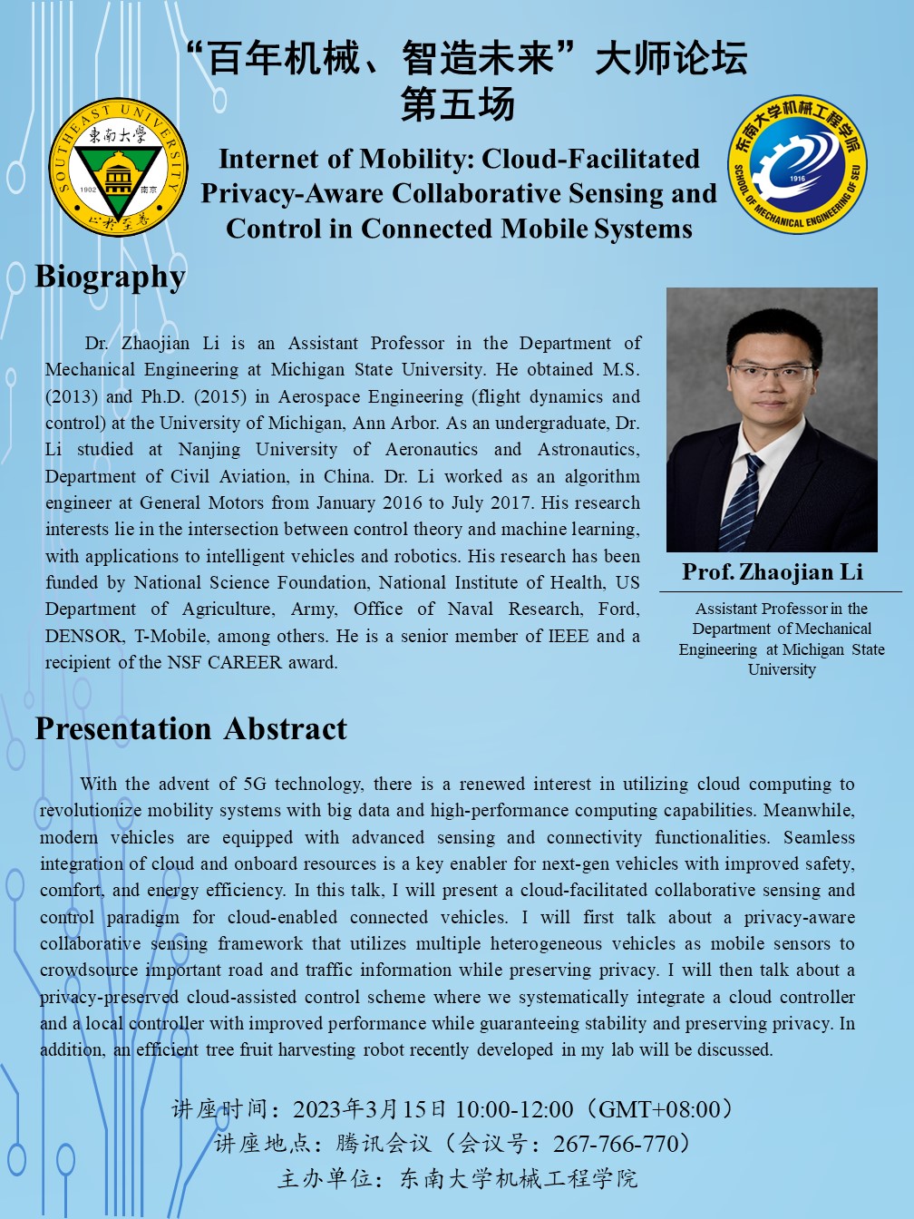 “百年机械、智造未来”大师论坛第五场:李照剑教授——Internet of Mobility: Cloud-Facilitated Privacy-Aware Collaborative Sensing and Control in Connected Mobile Systems