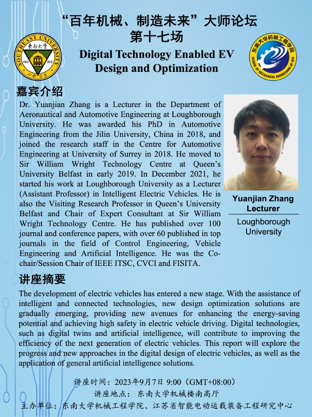 Dr. Yuanjian Zhang is a Lecturer in the Department of Aeronautical and Automotive Engineering at Loughborough University. He was awarded his PhD in Automotive Engineering from the Jilin University, China in 2018, and joined the research staff in the Centre for Automotive Engineering at University of Surrey in 2018. He moved to Sir William Wright Technology Centre at Queen’s University Belfast in early 2019. In December 2021, he started his work at Loughborough University as a Lecturer (Assistant Professor) in Intelligent Electric Vehicles. He is also the Visiting Research Professor in Queen’s University Belfast and Chair of Expert Consultant at Sir William Wright Technology Centre. He has published over 100 journal and conference papers, with over 60 published in top journals in the field of Control Engineering, Vehicle Engineering and Artificial Intelligence. He was the Co-chair/Session Chair of IEEE ITSC, CVCI and FISITA.