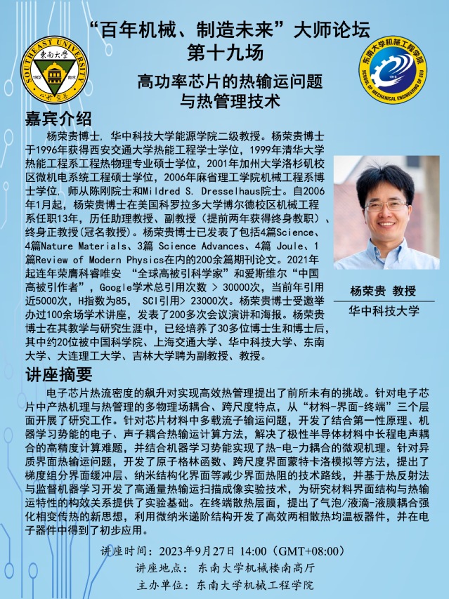 杨荣贵博士, 华中科技大学能源学院二级教授。杨荣贵博士于1996年获得西安交通大学热能工程学士学位,1999年清华大学热能工程系工程热物理专业硕士学位,2001年加州大学洛杉矶校区微机电系统工程硕士学位,2006年麻省理工学院机械工程系博士学位, 师从陈刚院士和Mildred S. Dresselhaus院士。自2006年1月起,杨荣贵博士在美国科罗拉多大学博尔德校区机械工程系任职13年,历任助理教授、副教授(提前两年获得终身教职)、终身正教授(冠名教授)。杨荣贵博士已发表了包括4篇Science、4篇Nature Materials、3篇 Science Advances、4篇 Joule、1篇Review of Modern Physics在内的200余篇期刊论文。2021年起连年荣膺科睿唯安 “全球高被引科学家”和爱斯维尔“中国高被引作者”,Google学术总引用次数 > 30000次,当前年引用近5000次,H指数为85, SCI引用> 23000次。杨荣贵博士受邀举办过100余场学术讲座,发表了200多次会议演讲和海报。杨荣贵博士在其教学与研究生涯中,已经培养了30多位博士生和博士后,其中约20位被中国科学院、上海交通大学、华中科技大学、天美传媒 、大连理工大学、吉林大学聘为副教授、教授。