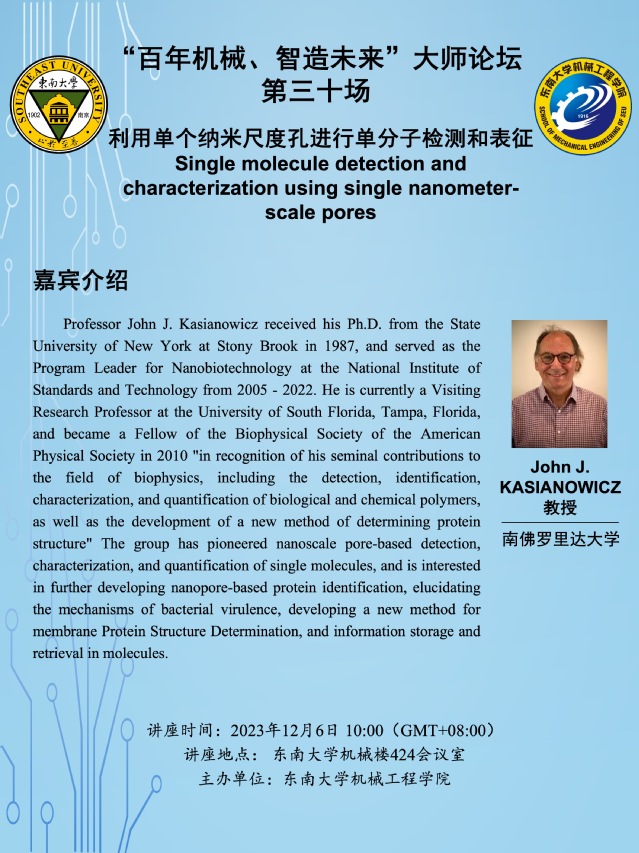 Professor John J. Kasianowicz received his Ph.D. from the State University of New York at Stony Brook in 1987, and served as the Program Leader for Nanobiotechnology at the National Institute of Standards and Technology from 2005 - 2022. He is currently a Visiting Research Professor at the University of South Florida, Tampa, Florida, and became a Fellow of the Biophysical Society of the American Physical Society in 2010 in recognition of his seminal contributions to the field of biophysics, including the detection, identification, characterization, and quantification of biological and chemical polymers, as well as the development of a new method of determining protein structure The group has pioneered nanoscale pore-based detection, characterization, and quantification of single molecules, and is interested in further developing nanopore-based protein identification, elucidating the mechanisms of bacterial virulence, developing a new method for membrane Protein Structure Determination, and information storage and retrieval in molecules.