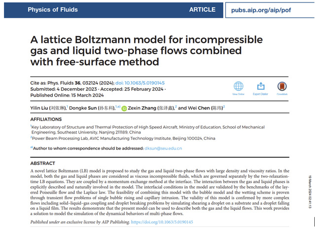 近日,天美传媒 2021级硕士研究生刘依琳在格子玻尔兹曼方法多相流建模方面取得新进展,相关研究成果以“A lattice Boltzmann model for incompressible the gas and liquid two-phase flows combined with free-surface method”为题发表在《Physics of Fluids》(流体物理学,PoF)。该期刊创建于1958年,致力于发表原创理论、计算和实验贡献,以了解气体、液体和复杂或多相流体的动力学,是美国物理联合会AIP旗下、中科院分区流体物理领域1区的期刊,最新影响因子4.6。