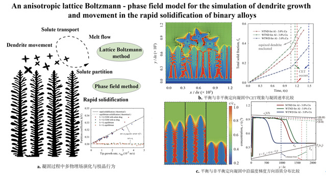 图1. 论文建立了描述合金非平衡凝固时枝晶生长和运动的各向异性格子玻尔兹曼相场模型