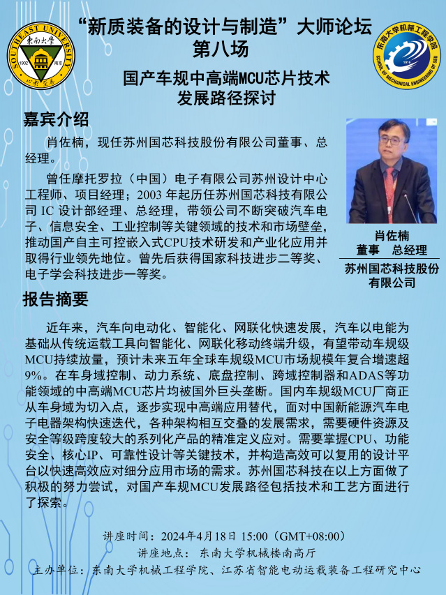 近年来, 汽车向电动化、 智能化、 网联化快速发展, 汽车以电能为基础从传统运载工具向智能化、 网联化移动终端升级, 有望带动车规级MCU持续放量, 预计未来五年全球车规级MCU市场规模年复合增速超9%。 在车身域控制、 动力系统、 底盘控制、 跨域控制器和ADAS等功能领域的中高端MCU芯片均被国外巨头垄断。 国内车规级MCU厂商正从车身域为切入点, 逐步实现中高端应用替代, 面对中国新能源汽车电子电器架构快速迭代, 各种架构相互交叠的发展需求, 需要硬件资源及安全等级跨度较大的系列化产品的精准定义应对。 需要掌握CPU、 功能安全、 核心IP、 可靠性设计等关键技术, 并构造高效可以复用的设计平台以快速高效应对细分应用市场的需求。 苏州国芯科技在以上方面做了积极的努力尝试, 对国产车规MCU发展路径包括技术和工艺方面进行了探索。