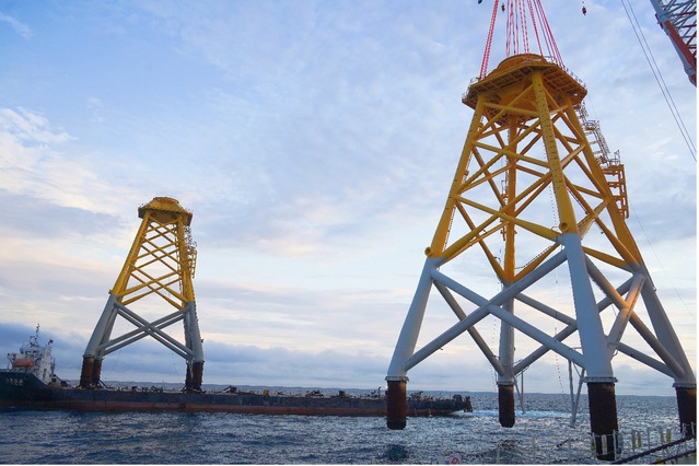本次夜间作业海况复杂、光线不足且水质浑浊,蛙人等传统水下观测方式严重受限,甚至无法正常工作。在上述恶劣条件下,联合团队利用最新研制的水下增强观测系统对导管架施工核心环节--导管架插桩施工过程进行全程跟踪和偏差修正数据实时反馈,保障插桩过程在十几分钟内一步到位,在确保施工质量的同时大大提升了施工效率和安全。