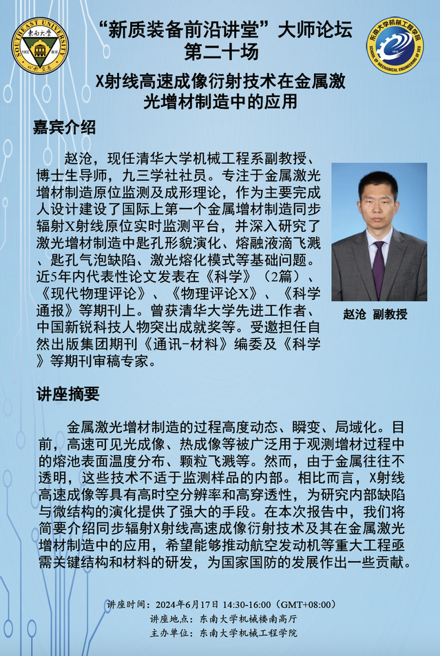 赵沧,现任清华大学机械工程系副教授、博士生导师,九三学社社员。专注于金属激光增材制造原位监测及成形理论,作为主要完成人设计建设了国际上第一个金属增材制造同步辐射X射线原位实时监测平台,并深入研究了激光增材制造中匙孔形貌演化、熔融液滴飞溅、匙孔气泡缺陷、激光熔化模式等基础问题。近5年内代表性论文发表在《科学》(2篇)、《现代物理评论》、《物理评论X》、《科学通报》等期刊上。曾获清华大学先进工作者、中国新锐科技人物突出成就奖等。受邀担任自然出版集团期刊《通讯-材料》编委及《科学》等期刊审稿专家。