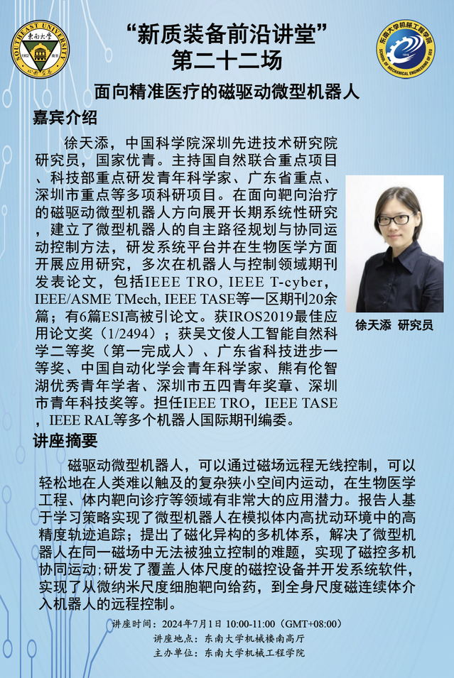 徐天添,中国科学院深圳先进技术研究院研究员,国家优青。主持国自然联合重点项目、科技部重点研发青年科学家、广东省重点、深圳市重点等多项科研项目。在面向靶向治疗的磁驱动微型机器人方向展开长期系统性研究,建立了微型机器人的自主路径规划与协同运动控制方法,研发系统平台并在生物医学方面开展应用研究,多次在机器人与控制领域期刊发表论文,包括IEEE TRO, IEEE T-cyber,IEEE/ASME TMech, IEEE TASE等一区期刊20余篇;有6篇ESI高被引论文。获IROS2019最佳应用论文奖(1/2494);获吴文俊人工智能自然科学二等奖(第一完成人)、广东省科技进步一等奖、中国自动化学会青年科学家、熊有伦智湖优秀青年学者、深圳市五四青年章、深圳市青年科技奖等。担任IEEE TRO,IEEE TASE,IEEE RAL等多个机器人国际期刊编委。