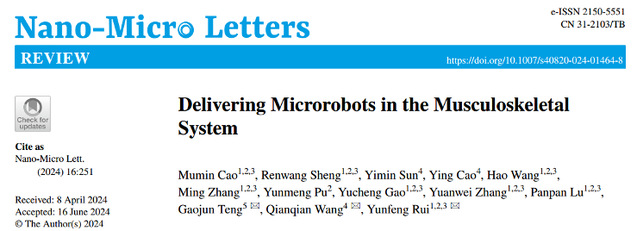 近日,天美传媒 王乾乾教授联合天美传媒 附属中大医院滕皋军院士及团队芮云峰教授,在微纳领域国际顶级期刊《Nano-Micro Letters》(中科院一区,IF=31.6)发表了题为“Delivering Microrobots in the Musculoskeletal System”的研究成果,在国际上率先对近年来微机器人在肌肉骨骼系统中的应用进展进行系统综述,重点介绍了用于组织再生的微机器人系统的设计策略。回顾了肌肉骨骼系统中微型机器人的制造,驱动和控制以及成像引导,并讨论了微机器人在肌肉骨骼系统和再生医学中未来临床应用的前景和挑战。(论文链接://link.springer.com/article/10.1007/s40820-024-01464-8)。