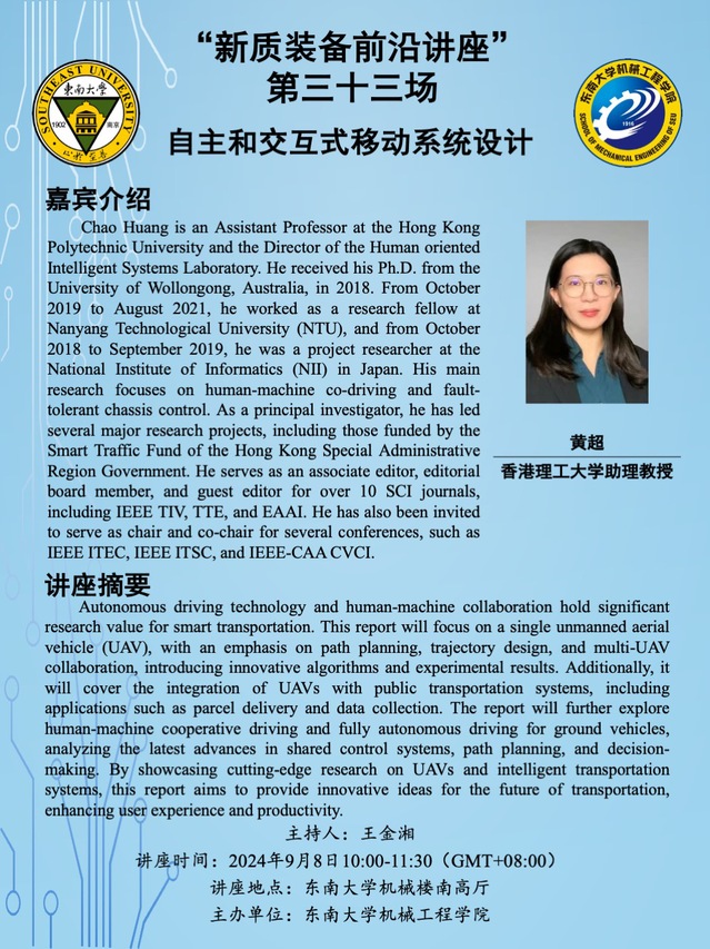 Chao Huang is an Assistant Professor at the Hong Kong Polytechnic University and the Director of the Human oriented Intelligent Systems Laboratory. He received his Ph.D. from the University of Wollongong, Australia, in 2018. From October 2019 to August 2021, he worked as a research fellow at Nanyang Technological University (NTU), and from October 2018 to September 2019, he was a project researcher at the National Institute of Informatics (NII) in Japan. His main research focuses on human-machine co-driving and fault-tolerant chassis control. As a principal investigator, he has led several major research projects, including those funded by the Smart Traffic Fund of the Hong Kong Special Administrative Region Government. He serves as an associate editor, editorial board member, and guest editor for over 10 SCI journals, including IEEE TIV, TTE, and EAAI. He has also been invited to serve as chair and co-chair for several conferences, such as IEEE ITEC, IEEE ITSC, and IEEE-CAA CVCI.