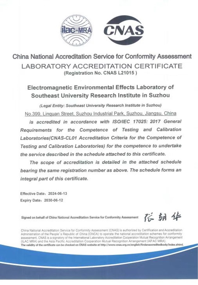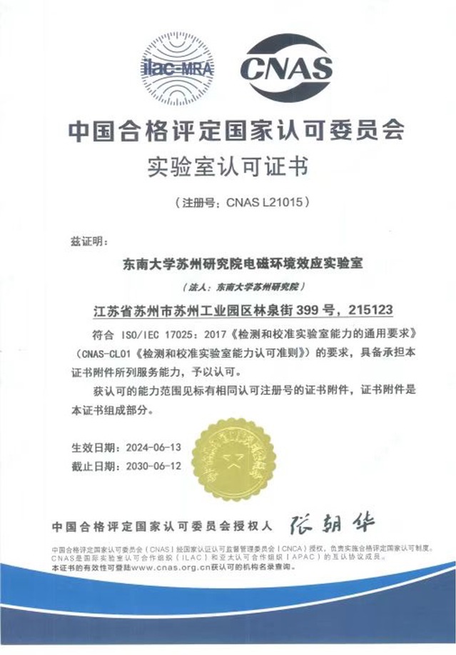 本次成功获得CNAS认可标志着实验室在电磁屏蔽材料和屏蔽体屏蔽效能、吸波材料吸波性能、电磁防护设施和装置防护性能、电子电气设备抗扰度、线缆屏蔽性能等电磁兼容领域能提供国家权威机构认可的检测服务,可以更有效地支撑学校相关学科发展。