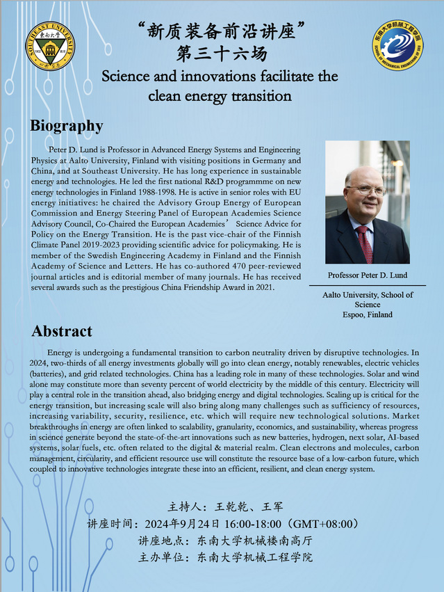 Peter D. Lund is Professor in Advanced Energy Systems and Engineering Physics at Aalto University, Finland with visiting positions in Germany and China, and at Southeast University. He has long experience in sustainable energy and technologies. He led the first national R&D programmme on new energy technologies in Finland 1988-1998. He is active in senior roles with EU energy initiatives: he chaired the Advisory Group Energy of European Commission and Energy Steering Panel of European Academies Science Advisory Council, Co-Chaired the European Academies’ Science Advice for Policy on the Energy Transition. He is the past vice-chair of the Finnish Climate Panel 2019-2023 providing scientific advice for policymaking. He is member of the Swedish Engineering Academy in Finland and the Finnish Academy of Science and Letters. He has co-authored 470 peer-reviewed journal articles and is editorial member of many journals. He has received several awards such as the prestigious China Friendship Award in 2021.