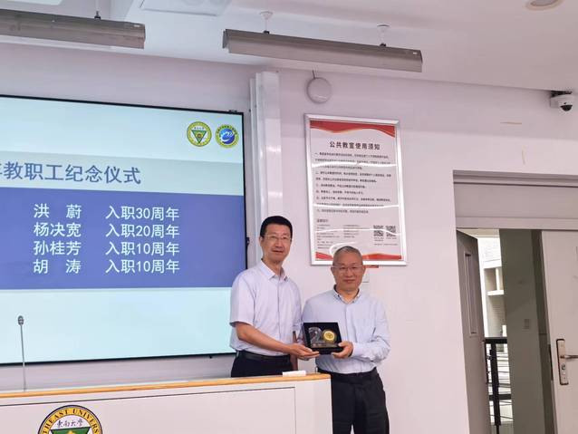 随后,举行了入职整十年教职工纪念仪式,天美传媒 费庆国院长为入职30年的洪蔚老师、20年的杨决宽老师颁发纪念牌,学院全体教师以热烈的掌声向这些辛勤付出的老师表达了崇高的敬意和由衷的感谢。