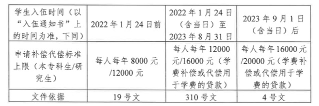 2023年9月,教育部等四部门印发了《关于调整完善助学贷款有关政策的通知》 (教财 (2023) 4 号,以下简称“4号文”),规定自2023 年秋季学期起,全日制普通本专科学生每人每年申请贷款额度由不超过12000 元提高至不超过 16000 元;全日制研究生每人每年申请贷款额度由不超过16000 元提高至不超过 20000 元。国家助学贷款额度调整后服兵役高等学校学生学费补偿、用于学费的贷款代偿和学费减免标准相应调整为本专科学生每人每年不超过 16000 元、研究生每人每年不超过20000 元。结合《财政部 教育部 人力资源社会保障部 退役军人部 中央军委国防动员部关于印发《学生资助资金管理办法) 的通知》 (财科教 (2019)19号,以下简称“19 号文”)及310 号文印发时间及规定不同时间入伍的学生,适用申请学费补偿或贷款代偿的标准如下: