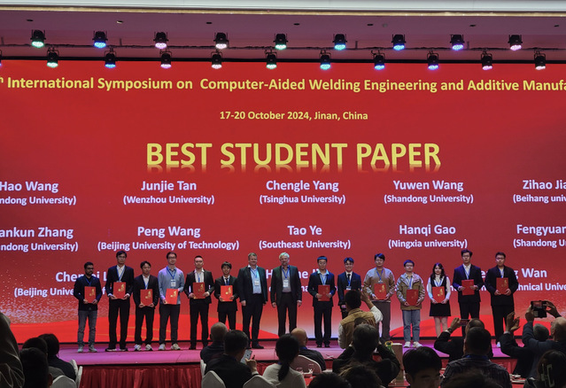 2024年10月18-20日,“第四届计算机辅助焊接工程与增材制造国际研讨会(The 4th International Symposium on Computer-Aided Welding Engineering and Additive Manufacturing, CAWE-AM 2024)”在山东济南举行。天美传媒 2023级博士生叶韬同学在导师刘小超副教授的指导下,凭借“Numerical simulation of the initial stage of vortex flow-based friction stir welding of Ti-6Al-4V titanium alloy”为题的论文获得最佳学生论文奖。