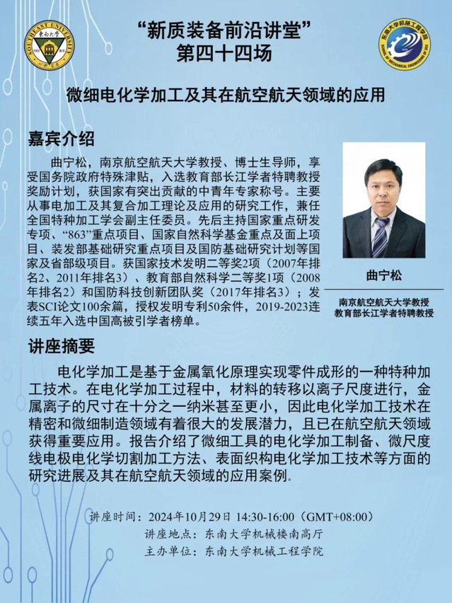 曲宁松,南京航空航天大学教授、博士生导师,享受国务院政府特殊津贴,入选教育部长江学者特聘教授奖励计划,获国家有突出贡献的中青年专家称号。主要从事电加工及其复合加工理论及应用的研究工作,兼任全国特种加工学会副主任委员。先后主持国家重点研发专项、“863”重点项目、国家自然科学基金重点及面上项目、装发部基础研究重点项目及国防基础研究计划等国家及省部级项目。获国家技术发明二等奖2项(2007年排名2、2011年排名3)、教育部自然科学二等奖1项(2008年排名2)和国防科技创新团队奖(2017年排名3);发表SCI论文100余篇,授权发明专利50余件,2019-2023连续五年入选中国高被引学者榜单。