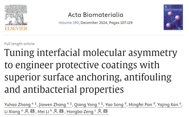 近日,天美传媒 2023级硕士研究生张宇浩在生物材料期刊《Acta Biomaterialia》(中科院一区,IF=9.4)发表题为“Tuning Interfacial Molecular Asymmetry to Engineer Protective Coatings with Superior Surface Anchoring, Antifouling and Antibacterial Properties”的研究成果,设计了一种稳定防污抗菌的分子不对称结构涂层用于保护植入式生物医学设备。(论文链接://doi.org/10.1016/j.actbio.2024.10.015)