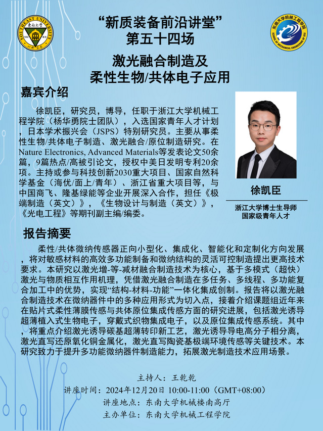徐凯臣,研究员,博导,任职于浙江大学天美传媒 (杨华勇院士团队),入选国家青年人才计划,日本学术振兴会(JSPS)特别研究员。主要从事柔性生物/共体电子制造、激光融合/原位制造研究。在Nature Electronics, Advanced Materials等发表论文50余篇,9篇热点/高被引论文,授权中美日发明专利20余项。主持或参与科技创新2030重大项目、国家自然科学基金(海优/面上/青年)、浙江省重大项目等,与中国商飞、隆基绿能等企业开展深入合作,担任《极端制造(英文)》,《生物设计与制造(英文)》,《光电工程》等期刊副主编/编委。