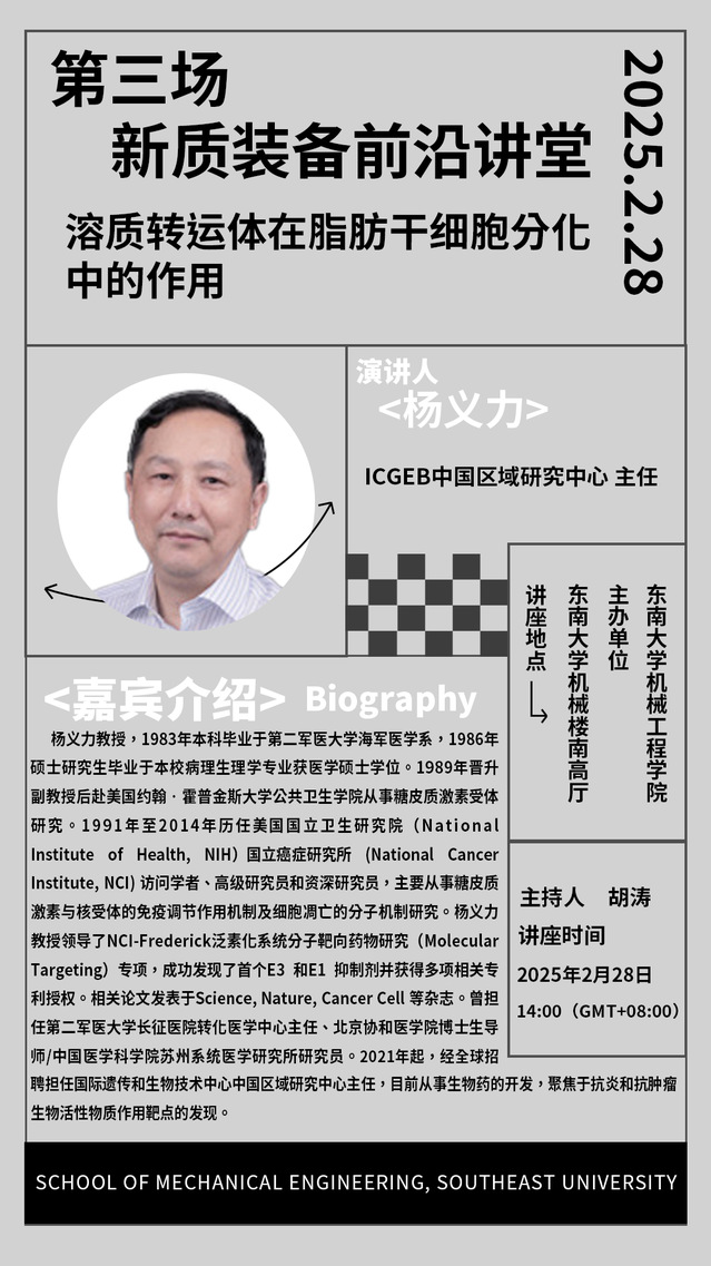 杨义力教授,1983年本科毕业于第二军医大学海军医学系,1986年硕士研究生毕业于本校病理生理学专业获医学硕士学位。1989年晋升副教授后赴美国约翰•霍普金斯大学公共卫生学院从事糖皮质激素受体研究。1991年至2014年历任美国国立卫生研究院(National Institute of Health, NIH)国立癌症研究所 (National Cancer Institute, NCI) 访问学者、高级研究员和资深研究员,主要从事糖皮质激素与核受体的免疫调节作用机制及细胞凋亡的分子机制研究。杨义力教授领导了NCI-Frederick泛素化系统分子靶向药物研究(Molecular Targeting)专项,成功发现了首个E3 和E1 抑制剂并获得多项相关专利授权。相关论文发表于Science, Nature, Cancer Cell 等杂志。曾担任第二军医大学长征医院转化医学中心主任、北京协和医学院博士生导师/中国医学科学院苏州系统医学研究所研究员。2021年起,经全球招聘担任国际遗传和生物技术中心中国区域研究中心主任,目前从事生物药的开发,聚焦于抗炎和抗肿瘤生物活性物质作用靶点的发现。