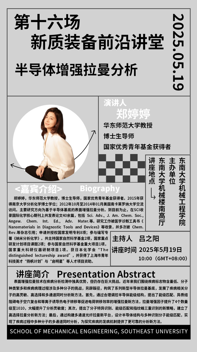 郑婷婷,华东师范大学教授,博士生导师,国家优秀青年基金获得者。2015年获得南京大学分析化学博士学位;2012年10月至2014年01月美国南卡莱罗纳大学交流访问。主要研究方向为基于半导体基底的表面增强拉曼分析。到目前为止,在SCI收录国际化学核心期刊上共发表论文40余篇,包括 Sci. Adv., J. Am. Chem. Soc., Angew. Chem. Int. Ed., Adv. Mater.等。研究工作被医学诊断工具书《Nanomaterials in Diagnostic Tools and Devices》等收录,并多次被 Chem. Rev.等杂志引用;申请并授权国家发明专利8项;参与编写专著《纳米分析化学》。共主持国家自然科学基金2项,国家重点研发计划项目课题2项;参与国家自然科学基金重大项目1项,国家重大科研仪器研制项目1项。获日本化学会“The distinguished lectureship award”,并获得了上海市青年科技英才“扬帆计划”与“启明星”等人才项目资助。