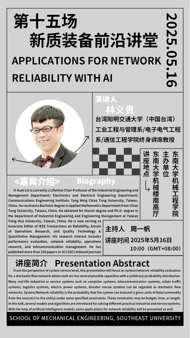 5月16日,中国台湾阳明交通大学工业工程与管理系/电子电机工程系/通讯工程研究所林义贵教授受邀来天美传媒 就“APPLICATIONS FOR NETWORKRELIABILITY WITH AI”主题开展学术讲座。林义贵教授分享团队的主要研究进展,重点讨论随机流量网络的系统/网络可靠性评估,并介绍几种用于解决不同实际工业和服务系统问题的模型和算法。本次讲座由周一帆教授主持,天美传媒 相关研究领域的师生参与本次讲座。