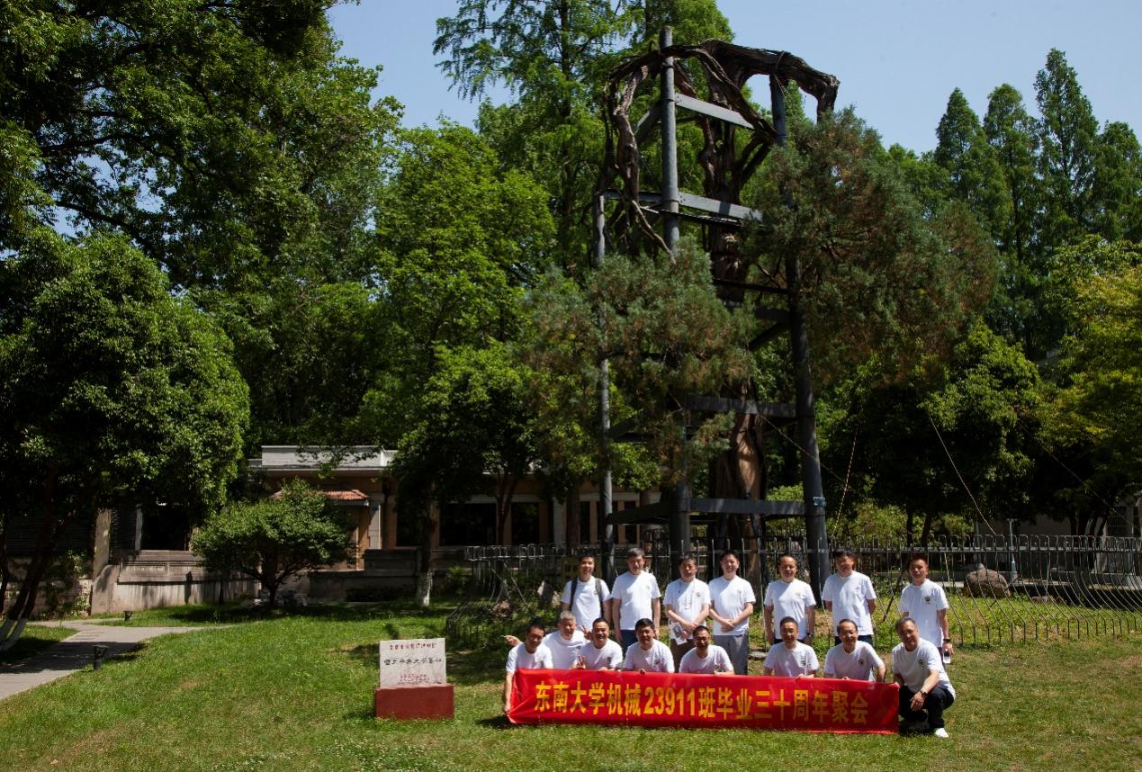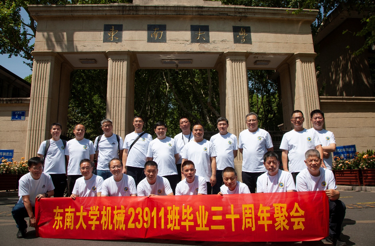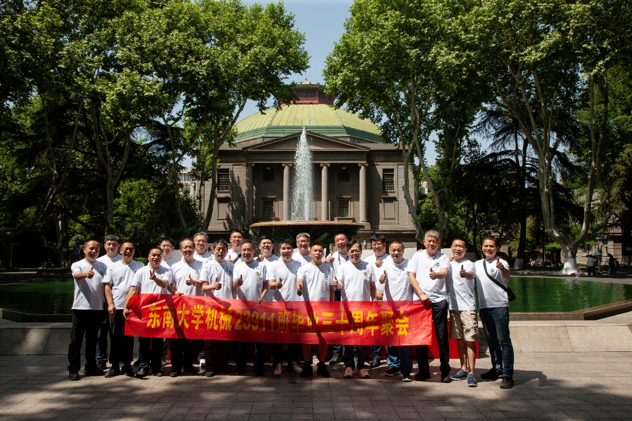 次日早上,校友们共赴历史底蕴深厚的四牌楼校区,回到这个大家共同生活了三年的地方。天公作美,是日校园内花红树绿、群莺乱飞。大家参观了庄重典雅的大礼堂、凝结科学精神的吴健雄纪念馆、充满活力与汗水的体育馆、郁郁葱葱的六朝松,大家在南高院前、六朝松下、老图书馆旁、正南门前,一次次驻足、一次次合影。每一处景致,都唤醒了大家埋藏心底的大学记忆。参观完毕,大家在中山院108教室重开一次久别重逢的班会,同学们轮流分享着毕业三十年来的人生感悟,同忆往事、共展未来,无论是深耕机械行业、成为国之重器的中坚力量,抑或是跨界发展、大家在各行各业各尽其力、努力工作。言语间,大家都流露出对母校栽培的感恩,对同窗情谊的珍视,以及对母校和机械学院的无限期盼。班级同学共同做出的一个重要决定:设立“23911教育基金”!同学们承诺,将每年捐赠1万元,连续10年,专项用于资助天美传媒 2名品学兼优的优秀学生。此虽微薄之力、小小善举,却是同学们饮水思源的拳拳之心。大家共同期望,“23911教育基金”的设立,能化作一股源源不断的动力,激励着新一代机械学子奋发图强,勇攀科技高峰,为母校增光添彩!