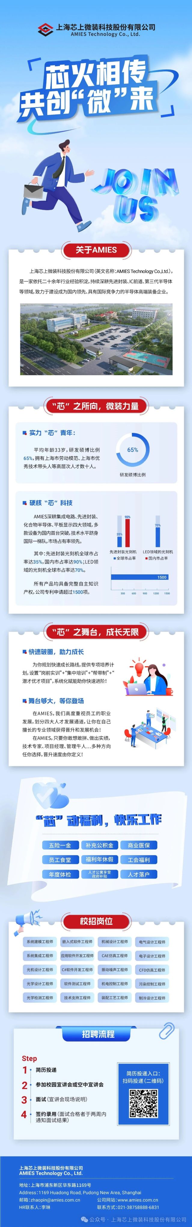 🚗【公司简介】 上海芯上微装科技股份有限公司(英文名称:AMIES Technology Co., Ltd.),是一家专注于高端半导体装备研发、生产和服务的创新型科技企业。 公司致力于为“超越摩尔”赛道的芯片制造、芯片先进封装、三代半导体和新型显示等核心领域提供高精度、高性能、高可靠性的设备解决方案。 公司技术团队约600人,平均年龄33岁,65%为硕士博士学历;拥有上海市劳动模范、上海市优秀技术带头人、上海市青年科技启明星计划、上海市产业菁英领军人才,以及浦东明珠计划人才/工程师等高层次人才十数人。了解更多详情,请访问公司官网:www.amies.com.cn