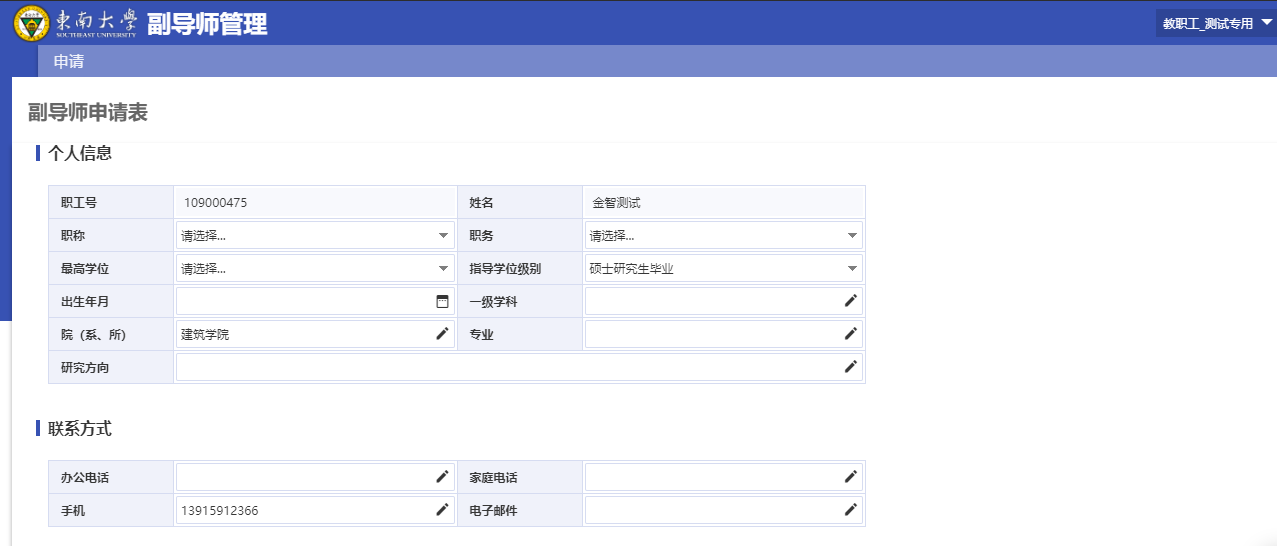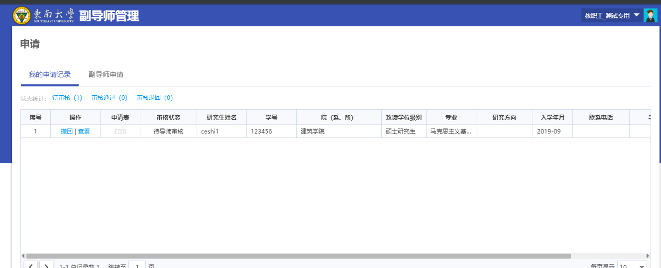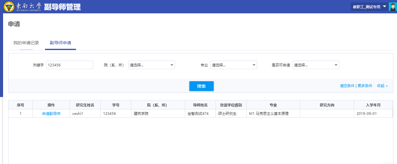 进入该模块之后,根据搜索条件(学号、姓名等)搜索想要的学生点击申请副导师按钮如图2-2-1,进入填写信息如图2-2-2,填写完点击提交按钮,流程走到下一环节待导师审核。申请未被审核可以收回。