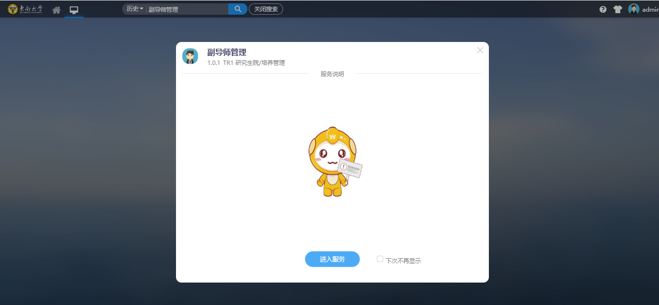 登录之后,系统主页面如图1-3-1所示,依次点击“可用应用→研究生院→培养管理→副导师管理”,或点击中上搜索框可以直接搜索需要使用的功能。