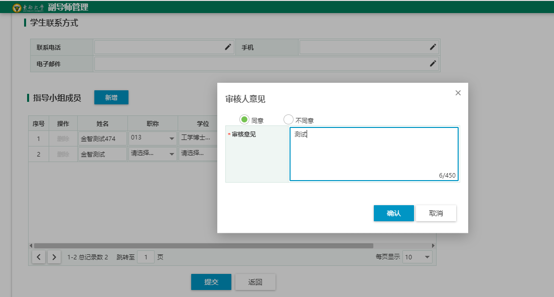 导师点击“提交”弹出审核意见界面如图2-4-5,填写审核意见后,流程进入到院系分管领导审核,院系分管领导审核后,流程转到研究生管理员,研究生管理员审核完,流程完成。