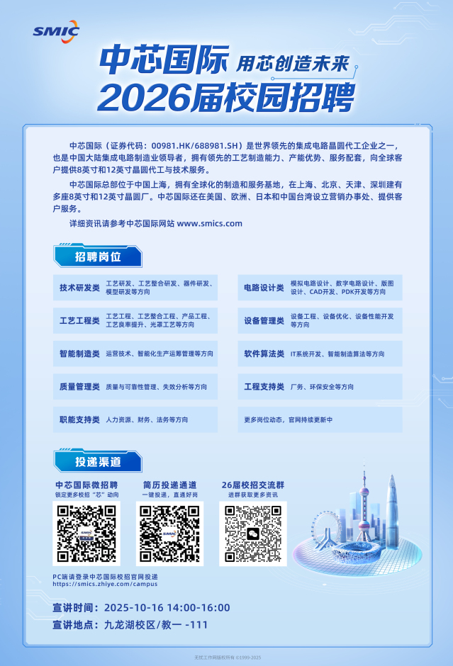 🌟 亲爱的同学们, 我们诚挚地邀请您参加“中芯国际”26届校园宣讲会!期待与您共同探索职业新篇章,携手开启精彩未来。