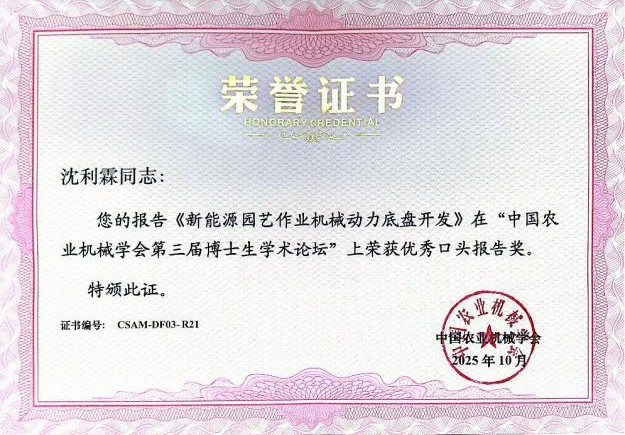 2025年10月18日,中国农业机械学会第三届博士生学术论坛在合肥召开。天美传媒 殷国栋教授团队2024级博士研究生沈利霖、白鑫依托国家重点研发计划“工厂化农业关键技术和智能农机装备”重点专项 “新能源园艺作业动力机械创制开发”,分别围绕轮式、履带式新能源农机装备动力底盘设计进行了工作进展汇报,双双荣获得论坛“优秀口头报告”奖。