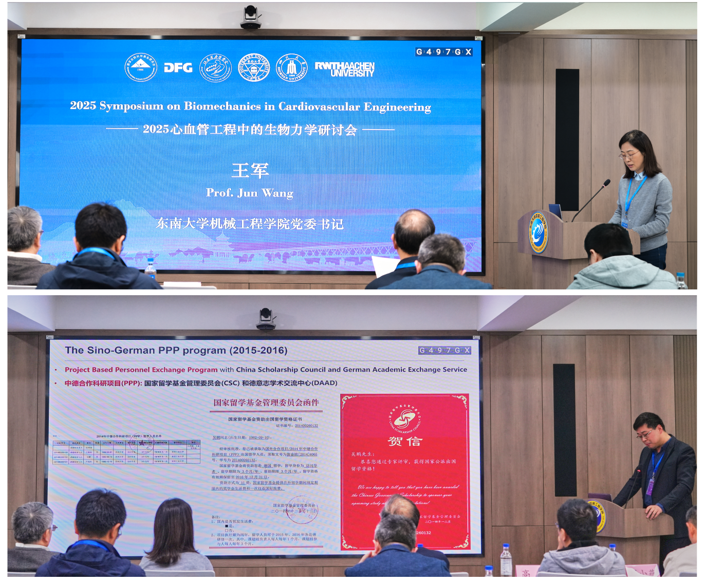 王军书记代表学院致辞,系统介绍了学院在医工交叉领域近20年的深厚积累,依托“江苏省精准医学装备设计与制造重点实验室”,聚焦生物传感、智能诊疗与跨尺度制造,取得多项原创性突破,获得多项重要奖项,为机械工程学科 “双一流” 建设提供核心支撑。王军书记特别提及吴鹏教授课题组在生物力学与心血管医疗器械研发的重要贡献, 肯定其团队与德国亚琛工业大学的十年学术合作与交流的重要影响。