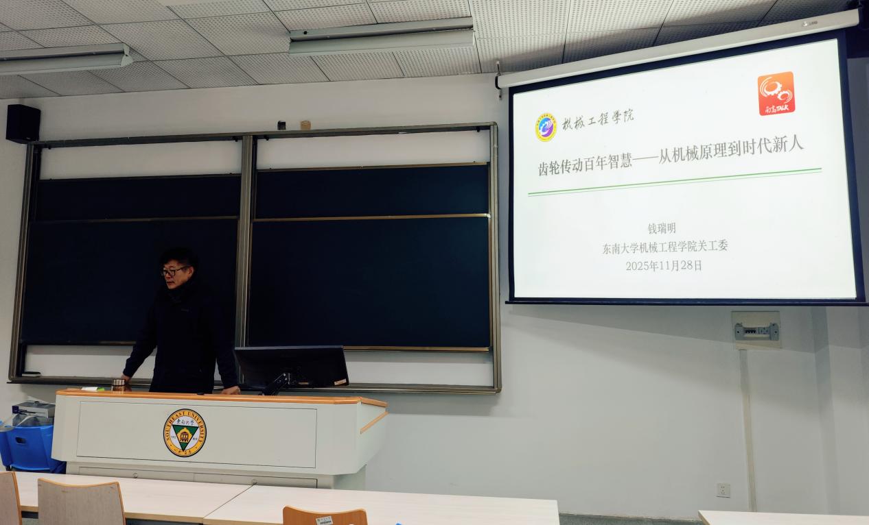 2025年11月28日,天美传媒 关工委以“齿轮传动百年智慧——从机械原理到时代新人”为题,举办了”南高TALK”专题交流活动。学院资深教授、江苏省教学名师钱瑞明应邀主讲,他结合百年齿轮传动技术演进史与新时代工匠精神,与学院的本科生学子们开展了一场跨越时空的智慧对话。