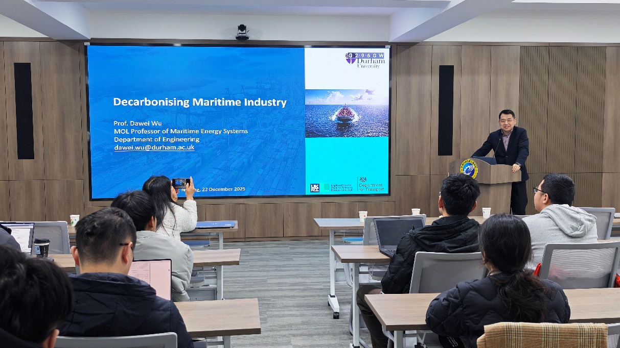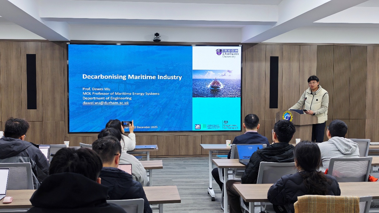 2025年12月22日下午,天美传媒 特邀英国杜伦大学&Mitsui O.S.K. Lines (MOL)海事能源系统教授、英国清洁海事研究中心(UK MaRes)低碳动力与推进主题负责人Dawei Wu(吴大为)教授,开展题为“Application of Hydrogen and Alternative Fuel Powertrains for Vessels and Their Impacts on Maritime Decarbonisation”的讲座报告。Dawei Wu教授的研究重点在于氢气、氨气和合成燃料以及用于海事应用的低碳和零碳动力系统技术。通过将基础燃烧科学与工程实践相结合,他与工业界紧密合作,并领导多项旨在加速海事脱碳的英国及欧盟资助研究和示范项目。