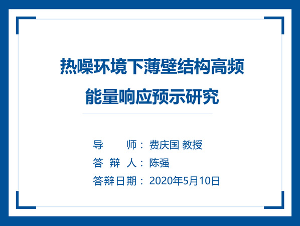 陈强同学本科和硕士阶段就读于南京航空航天大学,2016年9月加入研究所攻读博士学位,师从费庆国教授,主要研究方向是多场环境下飞行器结构中高频动响应预示,其博士论文题目为《热噪环境下薄壁结构高频能量响应预示研究》。论文发展了气动加热和气动噪声环境下薄壁结构在频域和时域能量响应预示方法,揭示了热效应、耦合强度、不确定性等因素对薄壁结构高频能量响应的影响规律,为高速飞行器结构的设计与研制提供指导。陈强同学攻博期间成绩优异,参加了多项国家级课题研究课题和型号攻关任务,主持了国家公派留学基金、江苏省博士研究生创新计划、天美传媒 优秀博士论文基金资助,以第一作者在AIAA/ASME会刊、Aerospace Science and Technology、航空动力学报等国内外航空航天期刊发表SCI论文6篇、EI论文4篇。