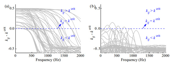 Fig. The differences of the correlation strength factors and the critical correlation strength factors when the plate is excited by (a) the IDF load or (b) the TBL load.
