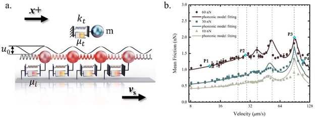 (a) Schematic diagram of the principle of atomic force microscopy testing of frictional force, where the research team proposed, for the first time internationally, a phonon friction model that correlates frictional resistance with slider vibration velocity; (b) The phonon friction model proposed by the research team accurately predicts the frictional force results obtained from atomic force microscopy testing.
