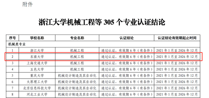 近日,中国工程教育专业认证协会发布了《关于公布浙江大学机械工程等305个专业认证结论的通知》(工认协〔2021〕13号),通知公示了2020年参加全国工程教育专业认证的认证结论。天美传媒 机械工程专业顺利通过认证,有效期6年(2021年-2026年),这是天美传媒 机械工程专业第四次通过教育部工程教育专业认证。从2007年至今,全国机械类专业通过教育部工程教育专业认证最多为4次,目前仅有4所985高校的机械类专业通过4次专业认证。机械工程专业也是2020年天美传媒 通过教育部工程教育专业认证的唯一专业。