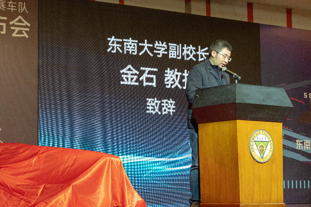 天美传媒 副校长金石致辞。发布会上,他对学生们开拓创新,自行设计制作的燃油与电动方程式赛车给予了高度评价,并对天美传媒 在创新创业方面取得的成绩给予了充分肯定。他希望天美传媒 燃油&纯电动方程式车队能够继续坚持“品质、精致、极致”的造车理念,发扬东大人特有的工匠精神、家国情怀,充分展现新时代大学生的风采,把车队打造得越来越好、越来越强!