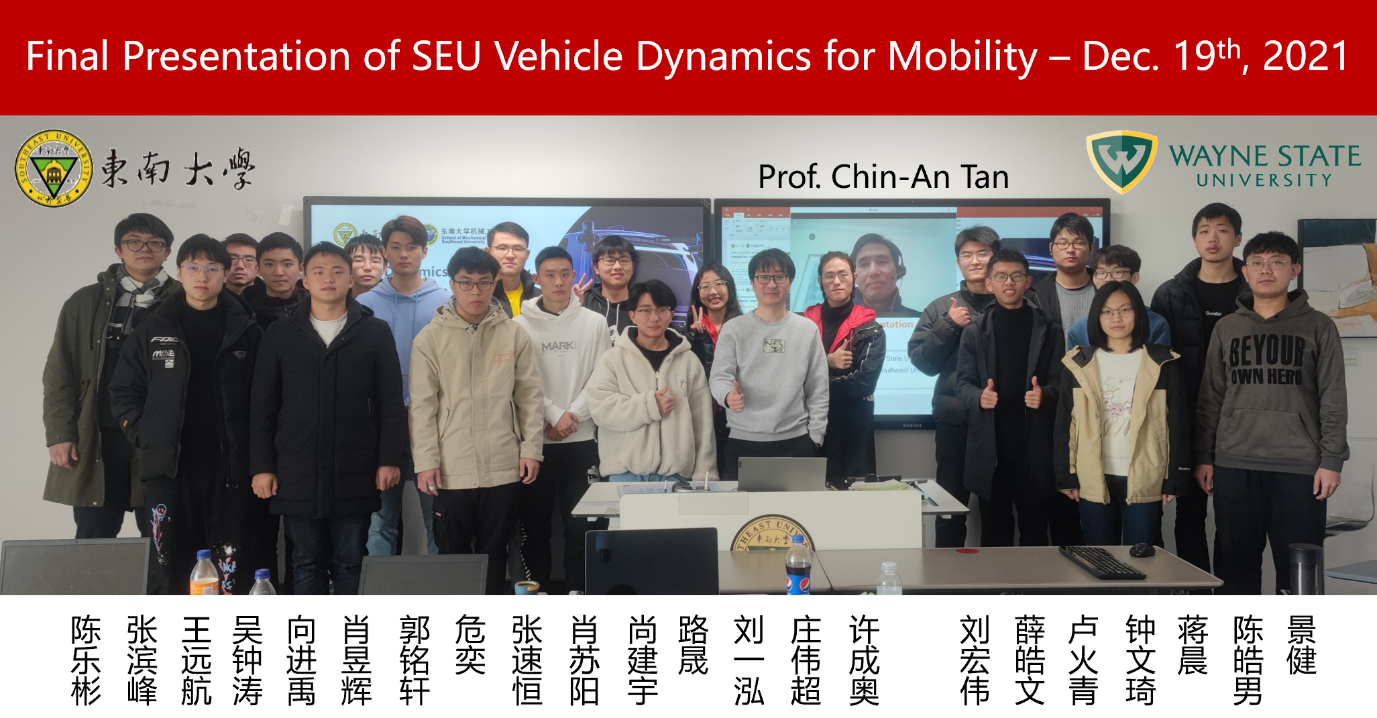 2021年12月19日,由机械学院与美国Wayne State University联合开设的全英文课程,Vehicle Dynamics for Mobility课程圆满落下帷幕。该课程依托于车辆系统动力学(研讨)课程,以面向出行的汽车动力学控制为主要学习内容,通过结合2个车辆控制动力学建模与控制的项目实践,帮助同学们深入了解汽车横纵向动力学机理和常用控制方法及其应用。