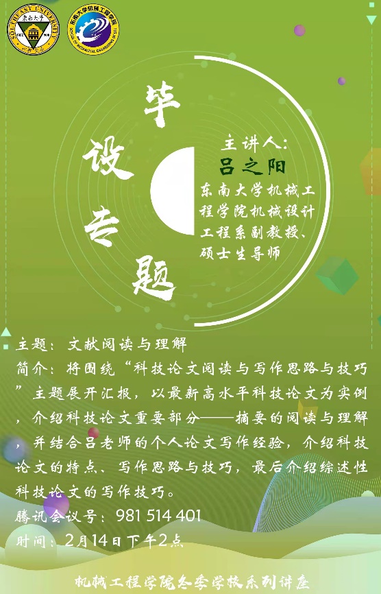 2月14日下午,毕业设计专题首场线上首场讲座开讲,由天美传媒 副教授、硕士生导师吕之阳老师围绕“科技论文阅读与写作思路与技巧”主题展开讲解。吕老师以最新高水平科技论文为实例,介绍科技论文重要部分——摘要的阅读理解,并结合吕老师的个人协作经验,介绍科技论文的特点、写作思路与技巧,并对综述性科技论文的写作技巧进行了详细阐述。在讲座的最后,吕老师针对同学们的问题发表了自己独特的见解,同学们收获颇丰。