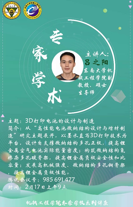 副教授吕之阳老师为同学们开展了一场关于3D打印技术的讲座。围绕着3D打印电池的设计与制造这一话题,吕之阳副教授通俗详尽地介绍了增材制造的技术定义,技术特点以及应用领域,并从未来可穿戴设备的发展及智能设备小型化的趋势,对体积更小、容量更大的电池的需求,结合3D打印电池的优越特点,高瞻远瞩地提出了3D打印在电池制造方面研究的必要性。最后,吕之阳副教授展示了自己在电池微纳结构的设计与3D打印构筑的具体成果,并对3D打印电池这一领域做出了积极的展望。