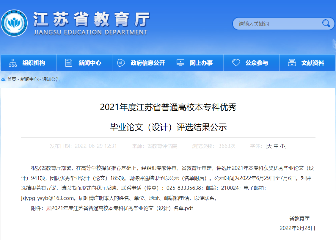 近日,江苏省教育厅公示了2021年省普通高校本专科优秀毕业设计(论文)评选结果,天美传媒 获优秀毕业设计(论文)二等奖1项,团队优秀毕业设计(论文)1项。