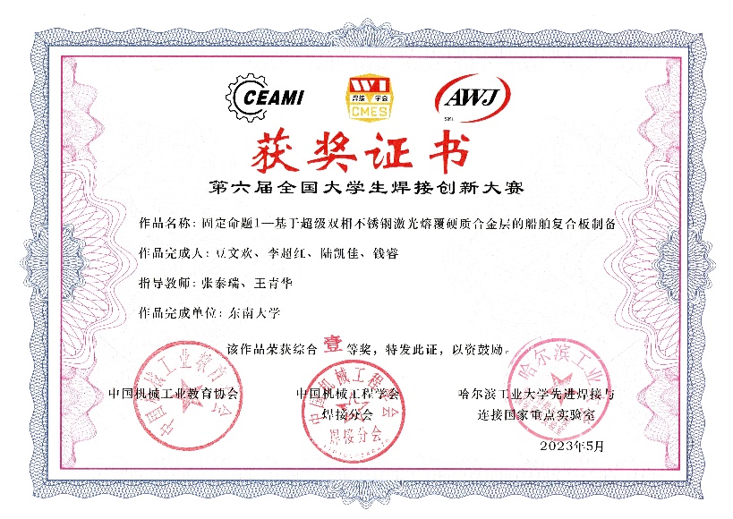 在学校教务处、天美传媒 的大力支持下,本届大赛天美传媒 代表队由刘小超副教授、李永哲副教授带队参加全国决赛,刘小超副教授受邀担任自由命题组评委。经过紧张激烈的比赛,天美传媒 由张泰瑞、王青华两位老师指导,豆文欢、李超红、陆凯佳、钱睿4位同学的项目《基于超级双相不锈钢激光熔覆硬质合金层的船舶复合板制备》获固定命题一等奖;由刘小超老师指导,罗璟玥、万宇、包文辉、李瑞茹4位同学的项目《基于搅拌-涡流-机械互锁的复合摩擦焊界面的金属异质构件增材制造技术研究》获自由命题二等奖;由李永哲老师指导,孟令一、黎明朗、杨书翰、施喆4位同学的项目《基于“Top 1/K”思想的大型金属构件多机协同增材任务分配与排程方法》、由裴宪军老师指导,张龙怀、蔡路、王郑、杨宇轩4位同学的项目《抗屈曲纤焊复合结构设计》分别获得自由命题和固定命题三等奖。
