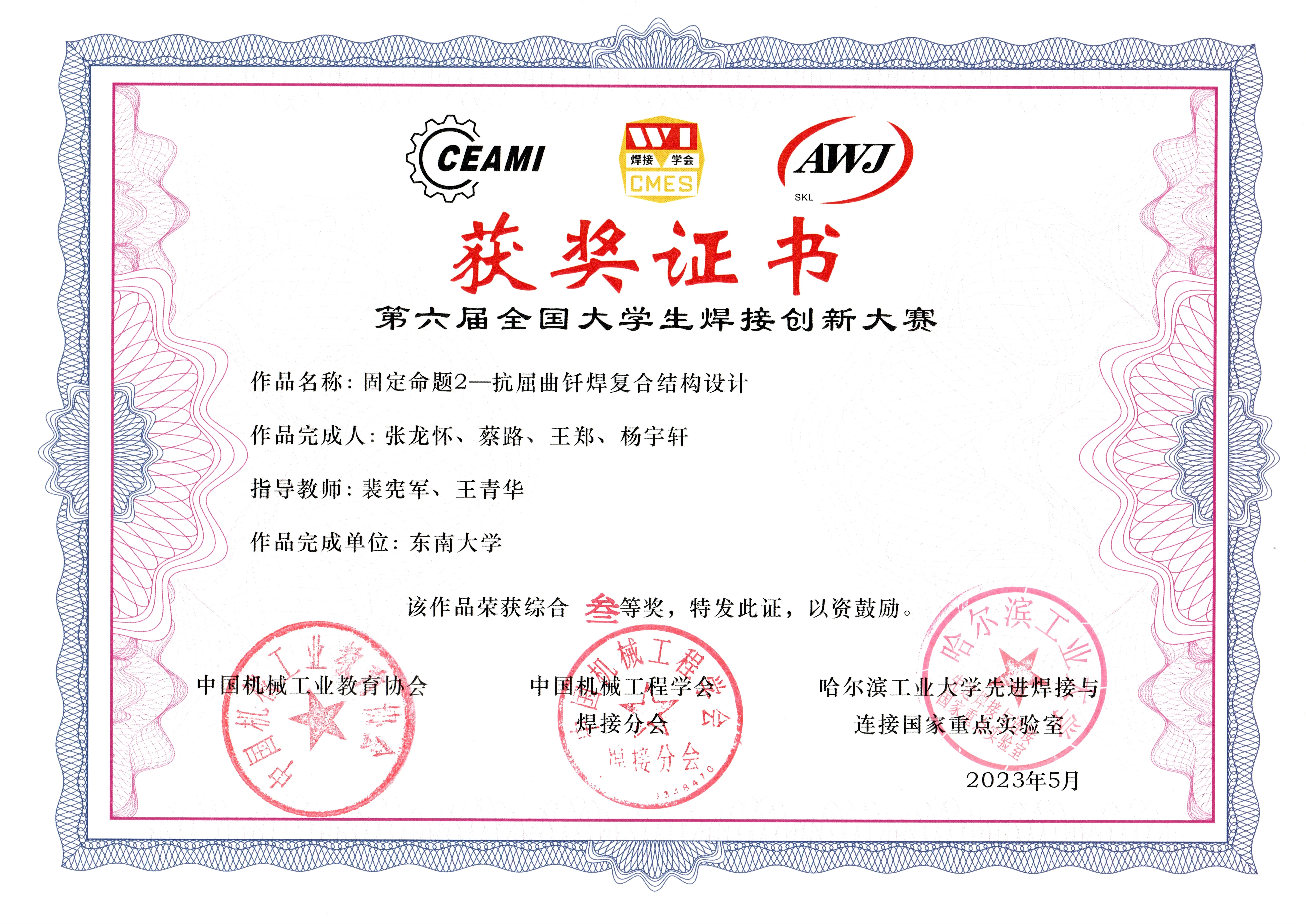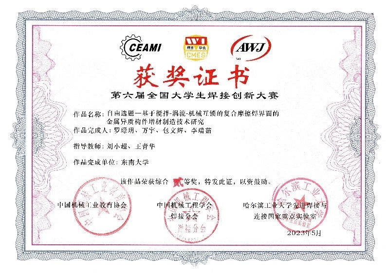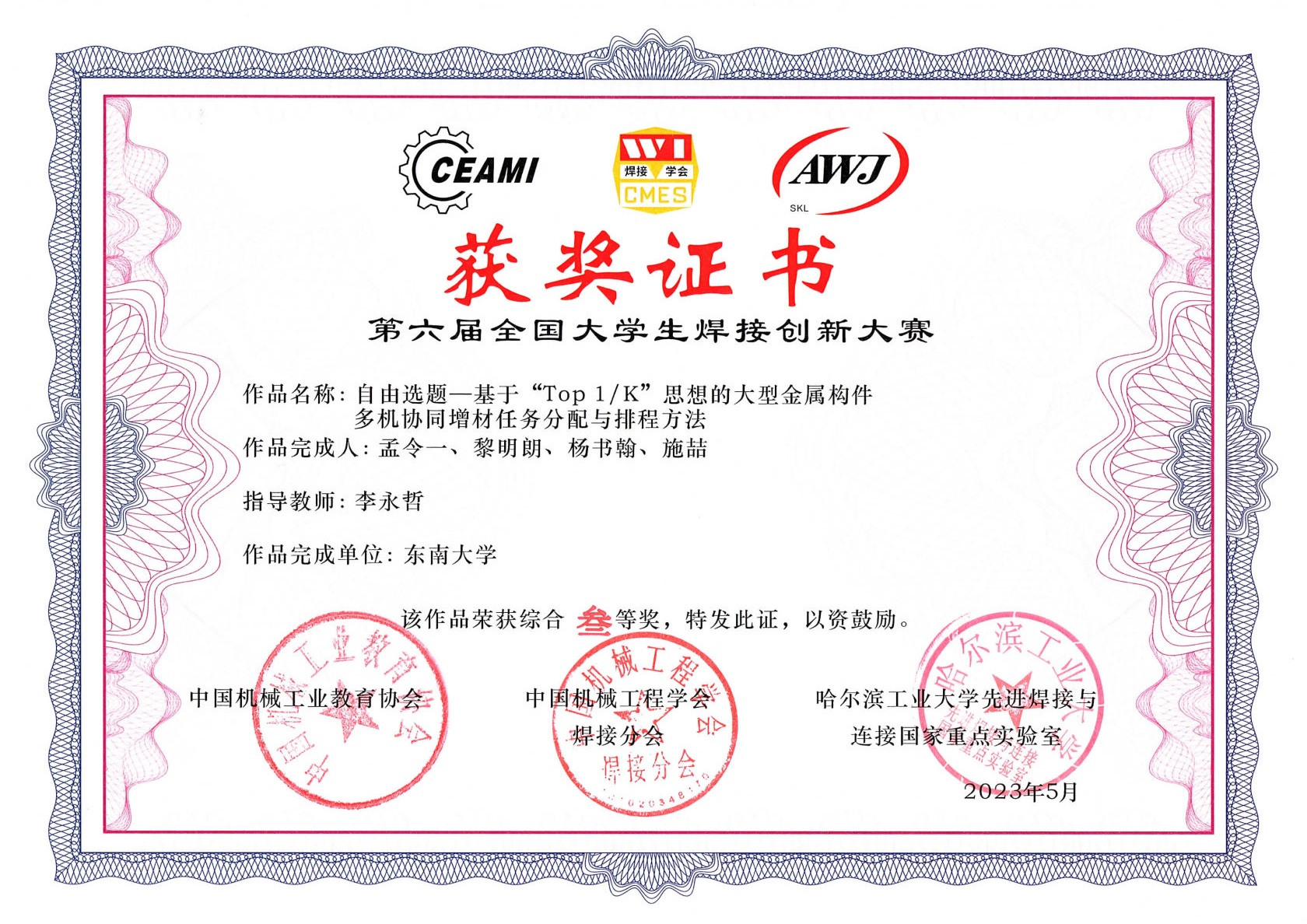 在学校教务处、天美传媒 的大力支持下,本届大赛天美传媒 代表队由刘小超副教授、李永哲副教授带队参加全国决赛,刘小超副教授受邀担任自由命题组评委。经过紧张激烈的比赛,天美传媒 由张泰瑞、王青华两位老师指导,豆文欢、李超红、陆凯佳、钱睿4位同学的项目《基于超级双相不锈钢激光熔覆硬质合金层的船舶复合板制备》获固定命题一等奖;由刘小超老师指导,罗璟玥、万宇、包文辉、李瑞茹4位同学的项目《基于搅拌-涡流-机械互锁的复合摩擦焊界面的金属异质构件增材制造技术研究》获自由命题二等奖;由李永哲老师指导,孟令一、黎明朗、杨书翰、施喆4位同学的项目《基于“Top 1/K”思想的大型金属构件多机协同增材任务分配与排程方法》、由裴宪军老师指导,张龙怀、蔡路、王郑、杨宇轩4位同学的项目《抗屈曲纤焊复合结构设计》分别获得自由命题和固定命题三等奖。